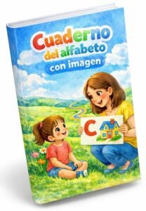 Cuaderno del alfabeto con imagen que asocia letras y dibujos, fortaleciendo memoria visual y aprendizaje lector.